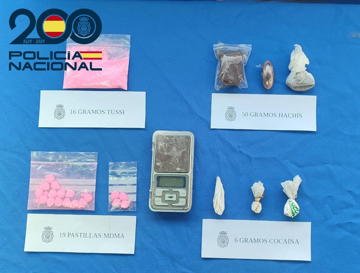 Con toda esta información, los agentes obtuvieron una orden de entrada y registro en el domicilio, donde encontraron dinero en efectivo y diversas cantidades de tusi, cocaína, MDMA y hachís. También pastillas para la disfunción eréctil, una balanza de precisión y diversos útiles para la preparación de las dosis.