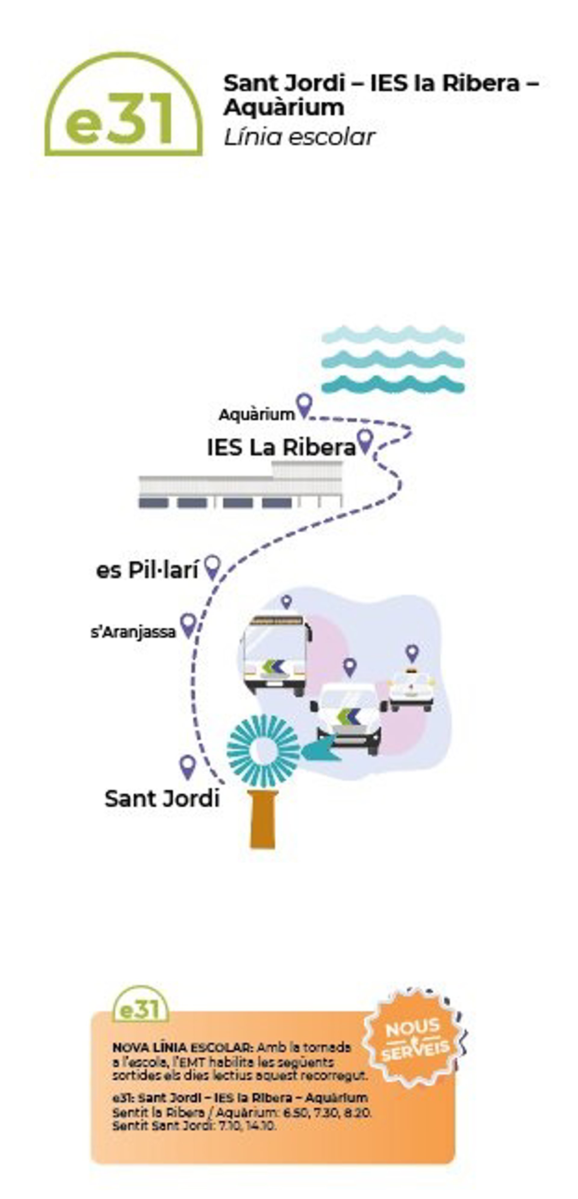 De esta forma, por un lado se conectará con la línea E31 Sant Jordi con el IES la Ribera deteniéndose en s'Aranjassa, es Pillarí, IES la Ribera y Aqurium. Esta nueva línea saldrá desde Sant Jordi hacia el Aquarium a las 6.50, 07.30 y 08.20 horas y desde el Aqurium en sentido Sant Jordi a las 07.10 y a las 14.10 horas.