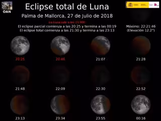 El eclipse total de Luna de este viernes 27 de julio, el más largo previsto para todo el siglo, será visible en toda España desde las 20.24 horas, con la Luna aún bajo el horizonte, hasta las 00.19 horas, según cálculos del Observatorio Astronómico Nacional (OAN). En concreto, será Baleares desde donde mejor pueda apreciarse el fenómeno.