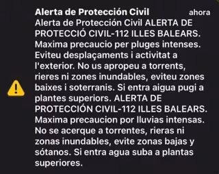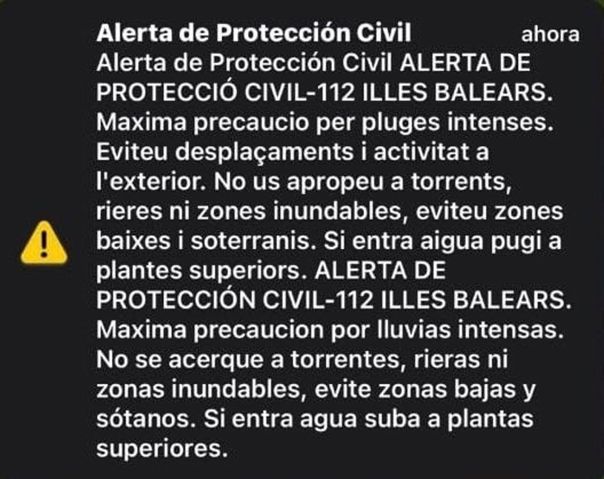 Mensaje 'Es-Alert' enviado a los vecinos del Llevant, norte y nordeste de Mallorca por la dana - EMERGENCIAS 112 BALEARES