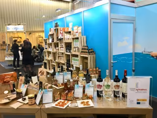 En el 'stand', se presentan aceite, vino, especias, confituras, sal, y derivados de la almendra y de la algarroba, de las empresas Agromallorca, Bodega Can Rich, Bodega Can Feliu, Especias Crespí, Es Garrover de Mallorca, Flor de Sal d'Es Trenc, Oli Nostro, y Vitalmend Baleares.