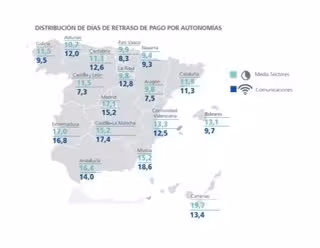 Por comunidades, el comportamiento de pagos aparece muy marcado por la división entre el norte y el sur de España. Murcia tiene el mayor retraso de pagos en el sector Comunicación acercándose a los 20 días (18,6). Castilla La Mancha es la siguiente con 17,4. Por detrás está Extremadura, con 16,8, y Madrid con 15,2.