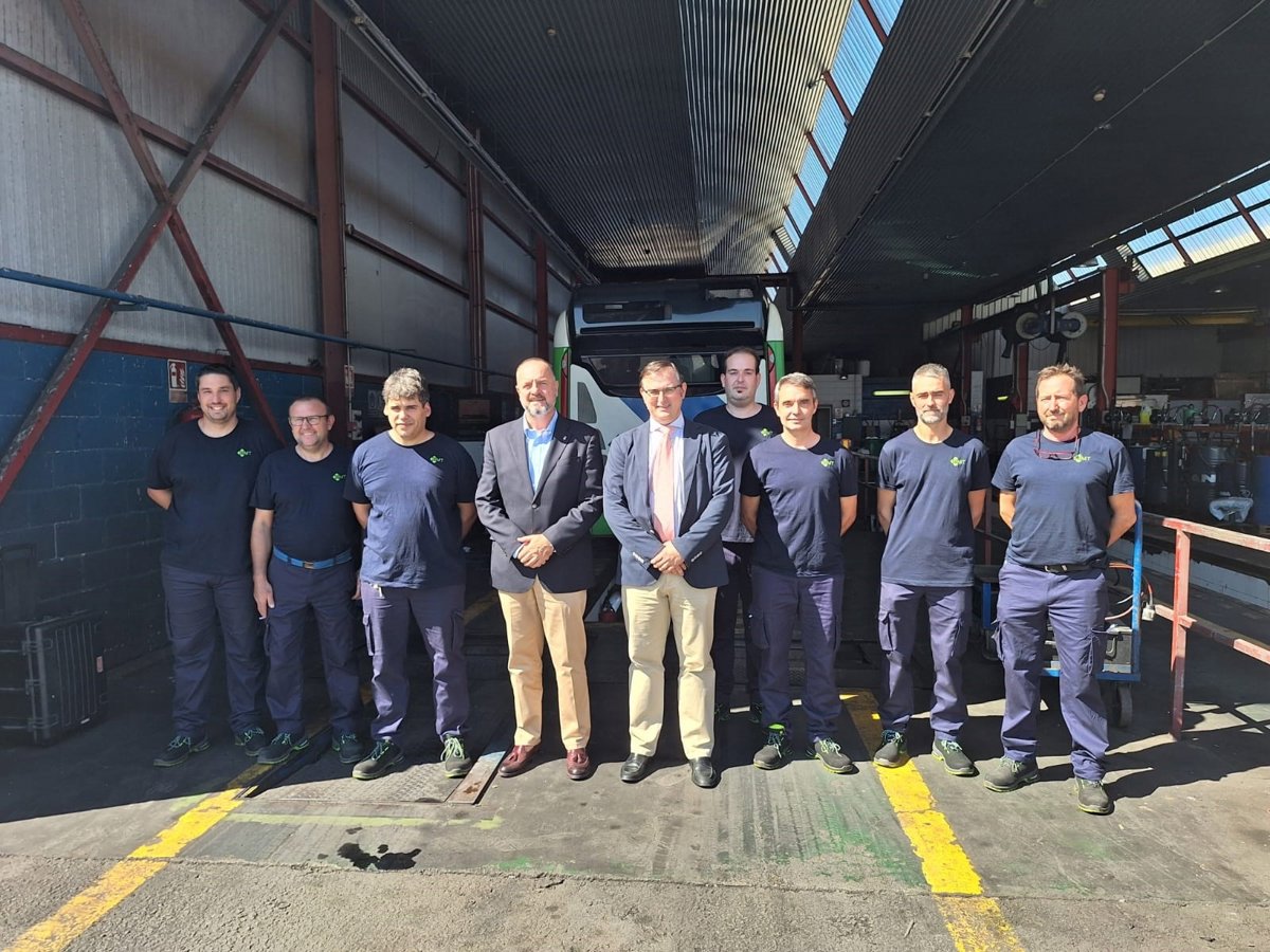 El regidor de Movilidad y Polígonos Industriales, Antoni Deudero, con los nueve mecánicos contratados para la EMT. - AYUNTAMIENTO DE PALMA