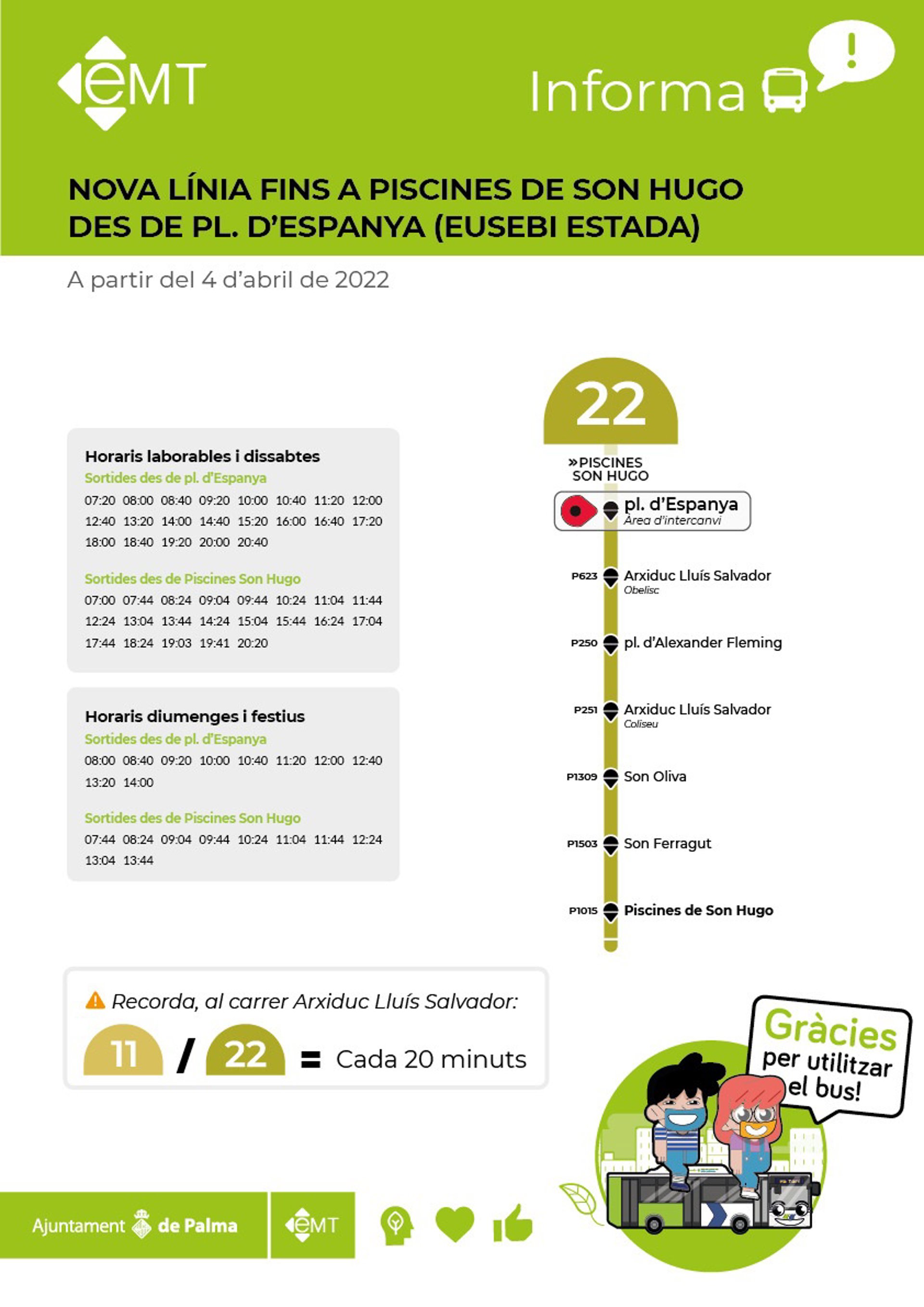 La Empresa Municipal de Transportes (EMT) de Palma ha informado este jueves sobre la introducción de la nueva línea L22 que conectará plaza España con las piscinas de Son Hugo a partir del próximo lunes 4 de abril.