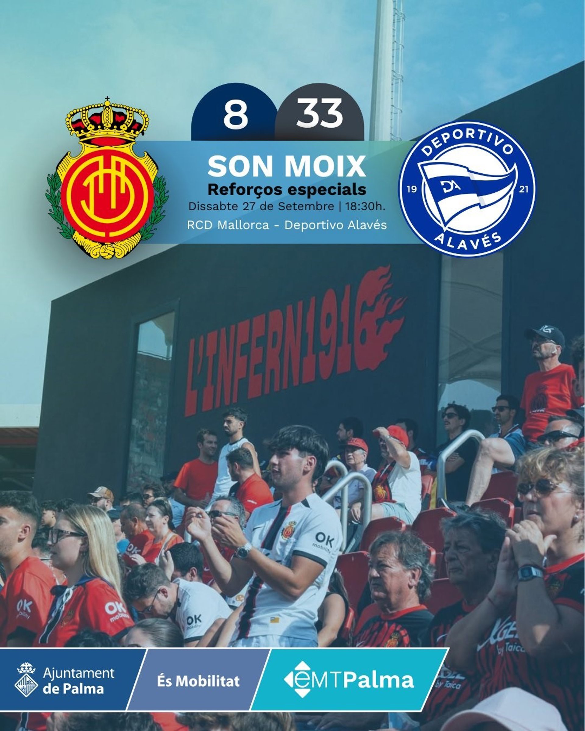 El Ayuntamiento de Palma pondrá en marcha el sábado 27 de septiembre un dispositivo especial de refuerzo de autobuses de la EMT en las líneas 8 y 33, de cara al partido que disputarán el RCD Mallorca y el Deportivo Alavés en el Estadi Mallorca Son Moix a las 18.30 horas.