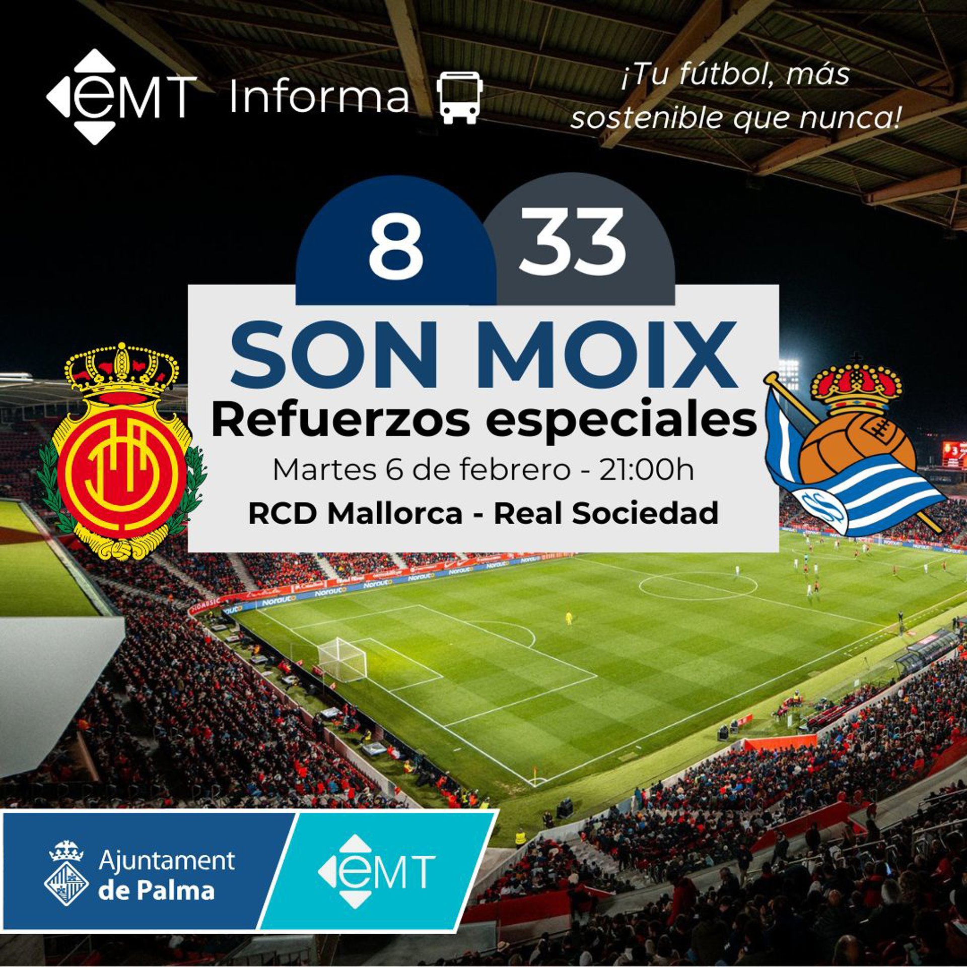 La EMT de Palma reforzará este martes sus servicios para el partido de la Copa del Rey entre el RCD Mallorca y la Real Sociedad que se disputará a las 21.00 horas en el Estadi Mallorca Son Moix.