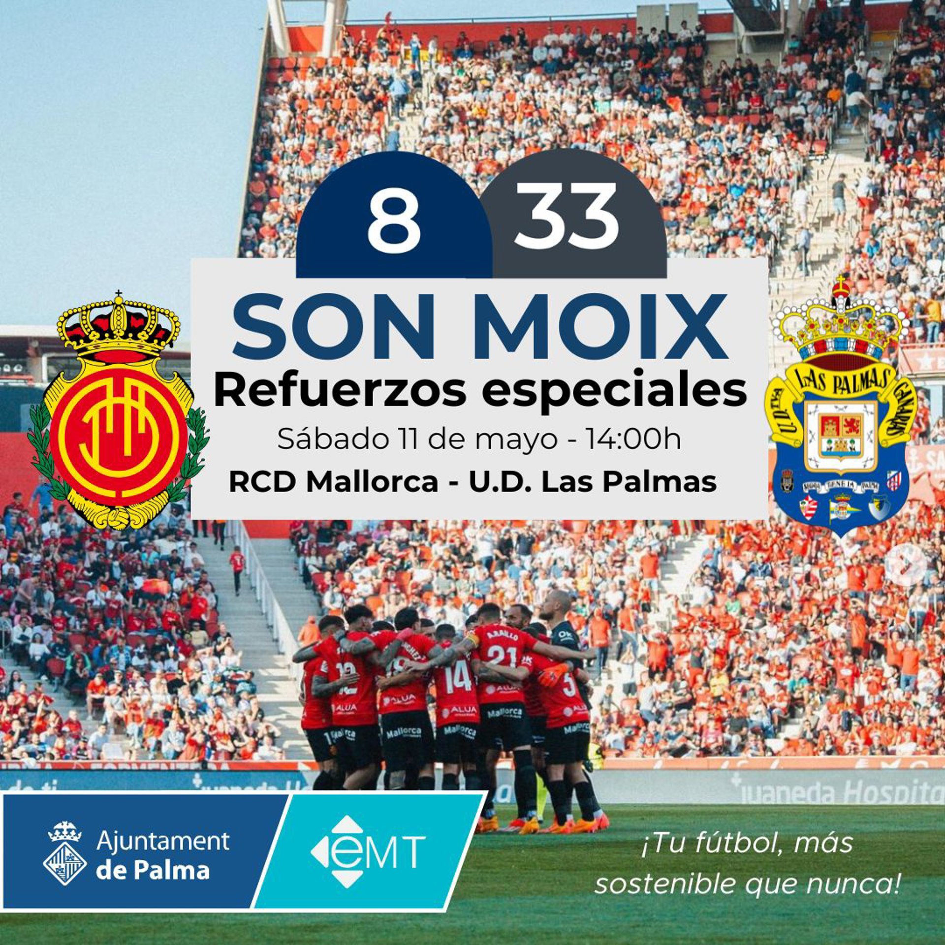 En concreto, la EMT reforzará el servicio con cuatro autobuses más en la línea L8 que va desde Sindicato al Estadi Mallorca Son Moix en las horas previas al partido, a partir de las 12.00 horas. Los refuerzos se suman al servicio habitual de esta línea que en esta franja horaria ofrece autobuses con una frecuencia media de 15 minutos.
