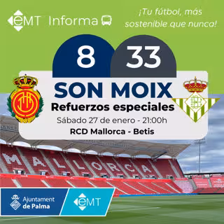 El Ayuntamiento de Palma reforzará los servicios de autobuses de la EMT este sábado con motivo del partido de fútbol entre el RCD Mallorca y el Real Betis, que tendrá lugar a las 21.00 horas en el Estadi Mallorca Son Moix.