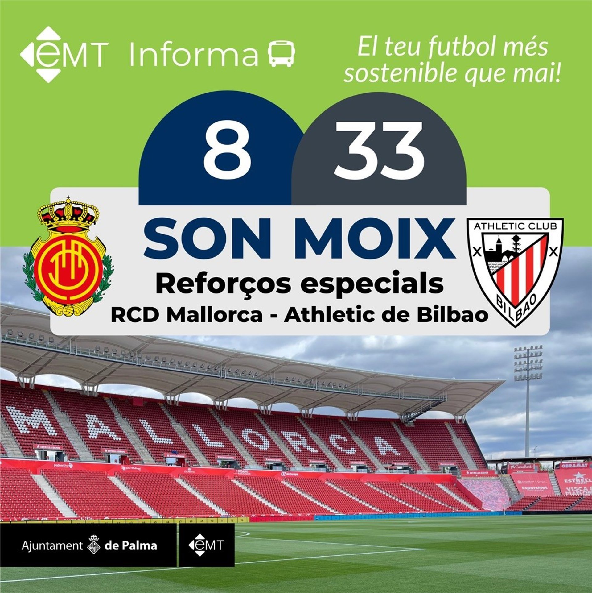 Cartel promocional de la EMT de Palma para promover el uso del transporte público para el partido RCD Mallorca-Athletic Club - AYUNTAMIENTO DE PALMA