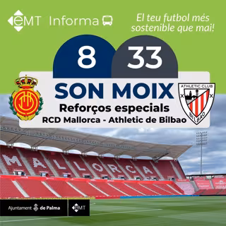 La Empresa Municipal de Transportes (EMT) de Palma reforzará las líneas de autobuses que hacen su recorrido por la zona del Estadio de Son Moix, con motivo del partido que disputará el RCD Mallorca contra el Athletic Club de Bilbao el próximo domingo a partir de las 16.15 horas.