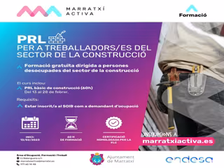La formación consta del curso PRL básico de construcción (60 horas), que se impartirá del 13 al 28 de febrero. En este curso se tratará, principalmente, formación relacionada con riesgos laborales, trabajos de demolición y rehabilitación, montaje y desmontaje de andamios, entre otros.