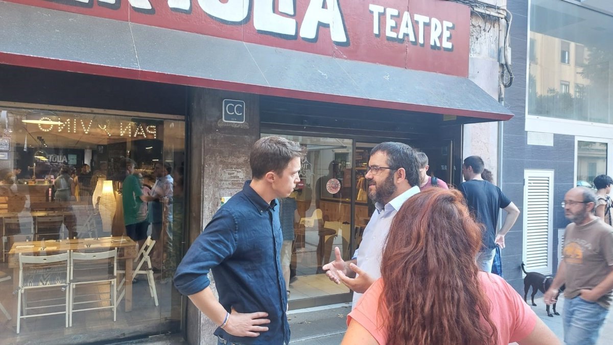 El candidato de Sumar por Madrid, Íñigo Errejón, y los candidatos de Sumar MÉS, Vicen Vidal y Viviana de Sans, charlan antes del acto electoral con jóvenes en Palma. - EUROPA PRESS