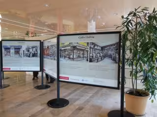 La exposición cuenta con diez paneles que recogen 16 establecimientos que permanecen abiertos y sobre los cuales se hace una comparativa fotográfica antes-ahora. También hay dos paneles dedicados a 18 establecimientos cerrados los últimos años.