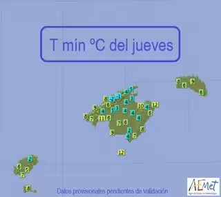 Con 6C de mínima se han encontrado Son Servera, Serra d'Alfbia, Porreres y aeropuerto de Palma; seguidas de Llucmajor, Calvi y Santanyí (con 7C); Andratx, Puerto de Sóller, Son Bonet y Portocolom (con 8C); Cap Blanc y Banyalbufar (con 9C); Colnia de Sant Pere (10C); Palma Portopí (11C), y Far de Capdera y Cabrera (12C).