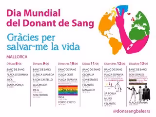 Así, en Mallorca se han organizado un total de 28 campañas esta semana, entre las que destaca la del miércoles, 10 de junio, en colaboración de BEN AMICS. El autobús 'Da Sangre' estará entre las 17.00 horas y las 21.00 horas en la Plaza de España.