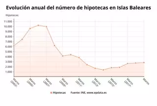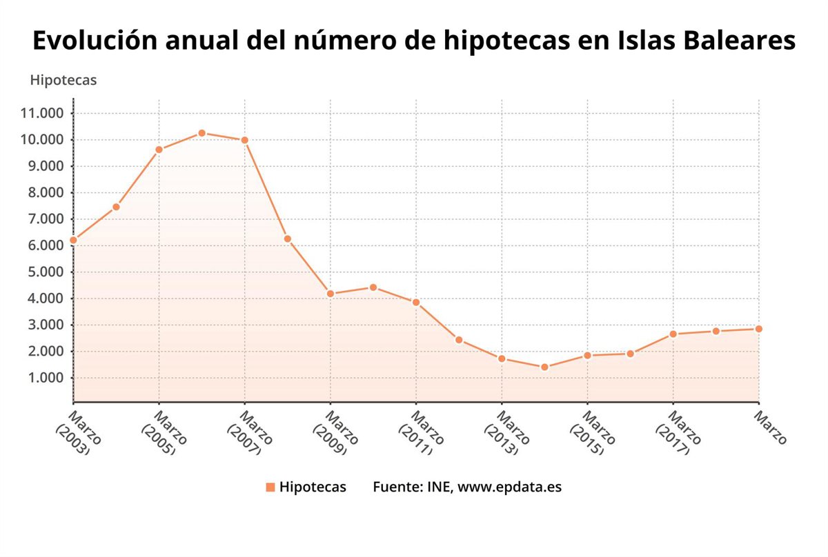 La firma de hipotecas sobre viviendas ha subido un 49,0% en Baleares en marzo en comparación con el mismo mes de 2018, frente al incremento del 15,8% de la media nacional, y alcanzó las 1.159 constituidas, según los datos difundidos este miércoles por el Instituto Nacional de Estadística (INE).