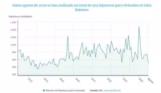 Evolución de la firma de hipotecas sobre viviendas en Baleares, hasta agosto de 2020. - EPDATA