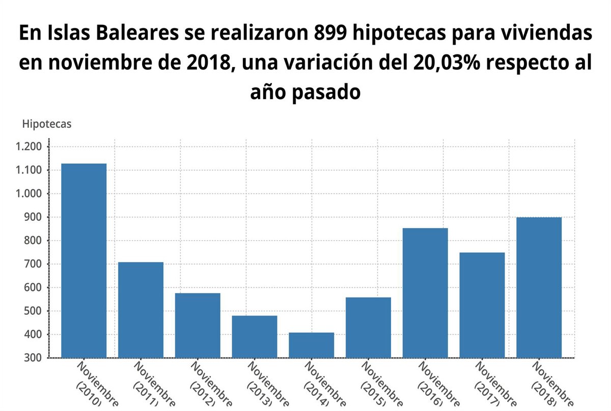 La firma de hipotecas sobre viviendas subió un 20% en Baleares en noviembre en comparación con el mismo mes de 2017, más que la media nacional (14,2%), y alcanzó las 899 constituidas, según los datos difundidos este miércoles por el Instituto Nacional de Estadística (INE).