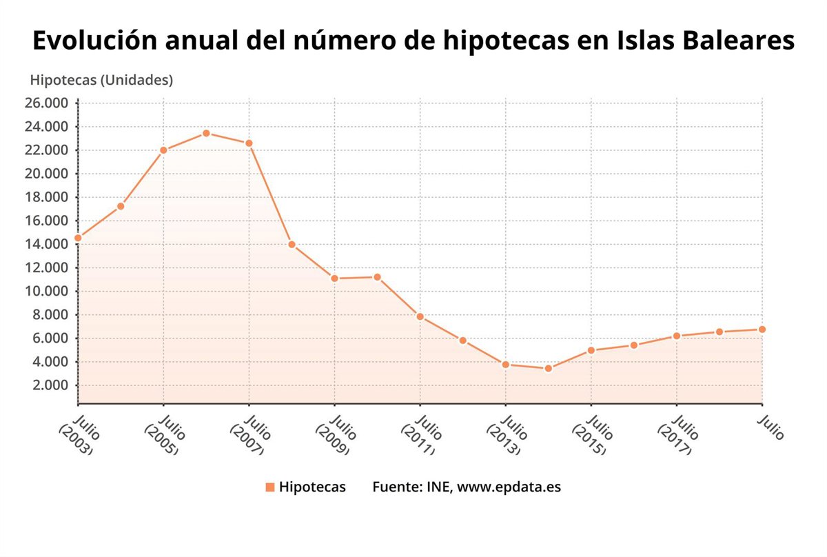 Baleares registró en julio un total de 937 nuevas hipotecas sobre viviendas, lo que representa una subida del 6,1% respecto al mismo mes de 2018, mientras que el capital prestado bajó un 19,7%, hasta los 150,1 millones de euros, según datos del Instituto Nacional de Estadística (INE) publicados este miércoles.