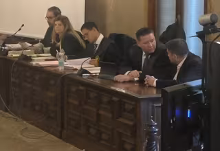 El acusado del asesinato de su esposa en 2018 en Ciutadella, hablando con su abogado al inicio del juicio este lunes, y junto a ellos, el abogado de la Comunidad Autónoma y los dos fiscales del caso. - TSJIB