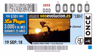 Las fotografías de los 19 ganadores del concurso 'Veo Evolución', organizado por la ONCE, ilustrarán más de 100 millones de Cupones de Diario de la ONCE durante los meses de septiembre, octubre y noviembre. En concreto, el miércoles, 19 de septiembre, el cupón lo ilustrará la foto titulada 'Libertad', de Luana Pons Pons, que ganó el certamen en Baleares.