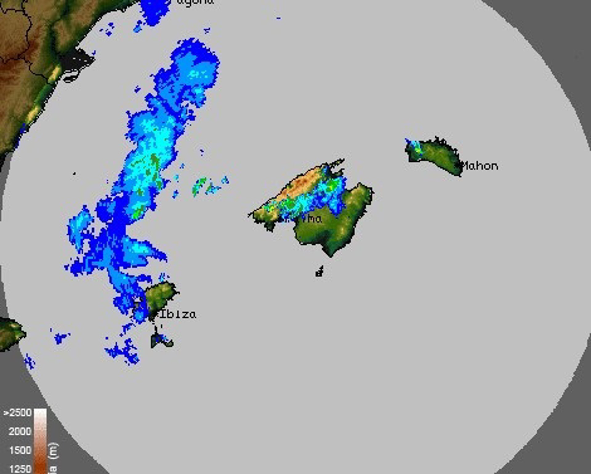 Imagen del radar que muestra las tormentas a su paso por las Pitiusas y Mallorca. - AEMET