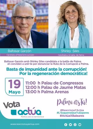 La formación Actúa, ha organizado para este domingo, en Calvià, un mitin electoral que contará con el candidato al parlamento europeo de la formación, Baltasar Garzón, la candidata al Consell de Mallorca y a la alcaldía de Calvià, Isabel Manresa, y la candidata de San Fernando, Montse Muñoz.