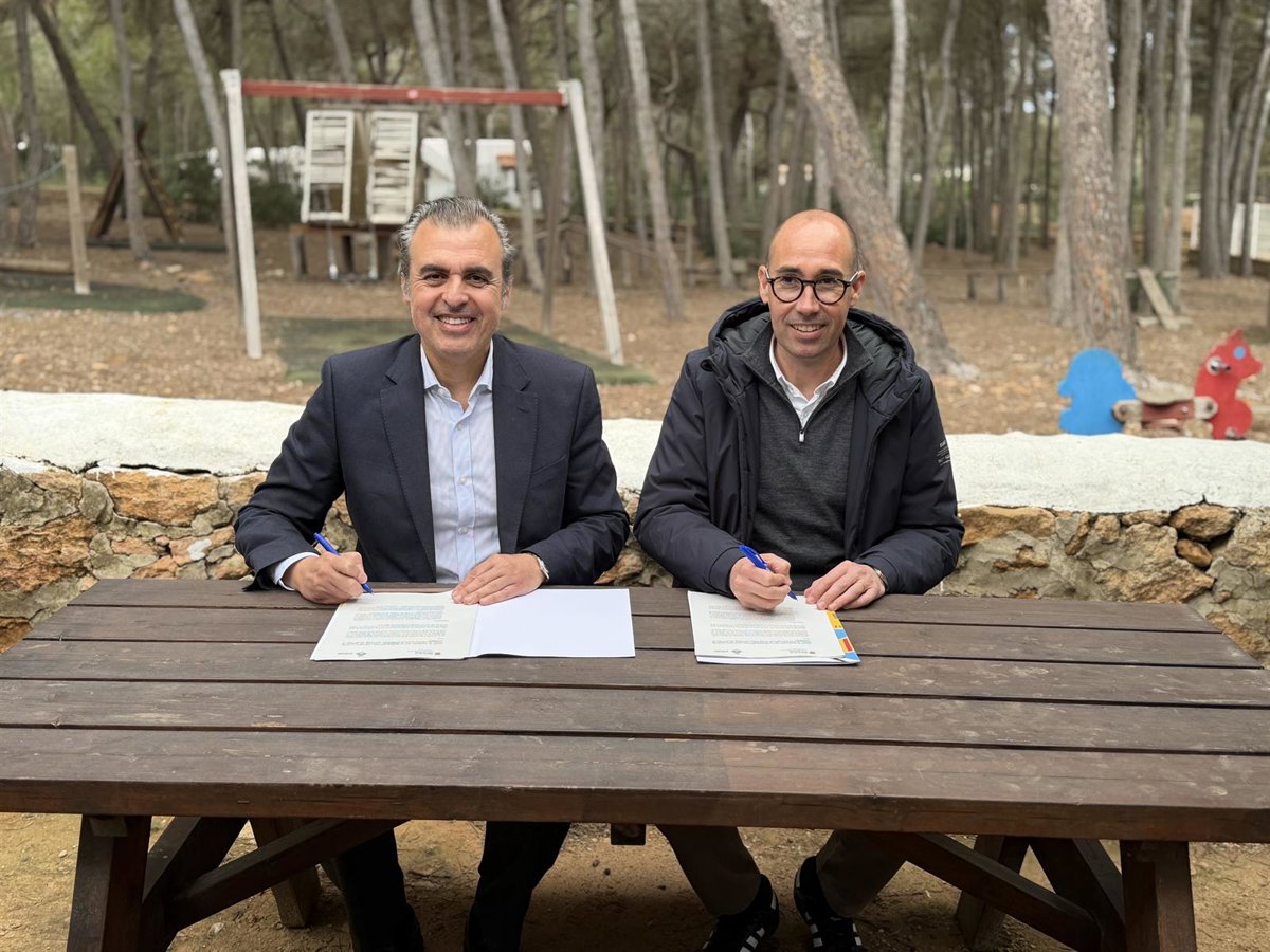El conseller de Educación y Universidades, Antoni Vera, y el presidente del Consell de Formentera, Óscar Portas, han firmado un convenio de colaboración para la financiación y la ejecución del proyecto de transformación del parque urbano y del patio del CEIP El Pilar, en la Mola, concebidos como refugio climático y espacio de convivencia.