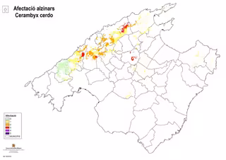 La superficie de encinar en las Islas Baleares es de 22.251 hectáreas, de las cuales 16.810 se encuentran en Mallorca, y el resto, en Menorca. Mientras que en esta última isla se ha constatado que no hay afectación, en Mallorca se ha comprobado el envejecimiento acelerado de la masa del encinar de las fincas públicas de Menut y de Binifaldó, las dos más atacadas por este insecto.