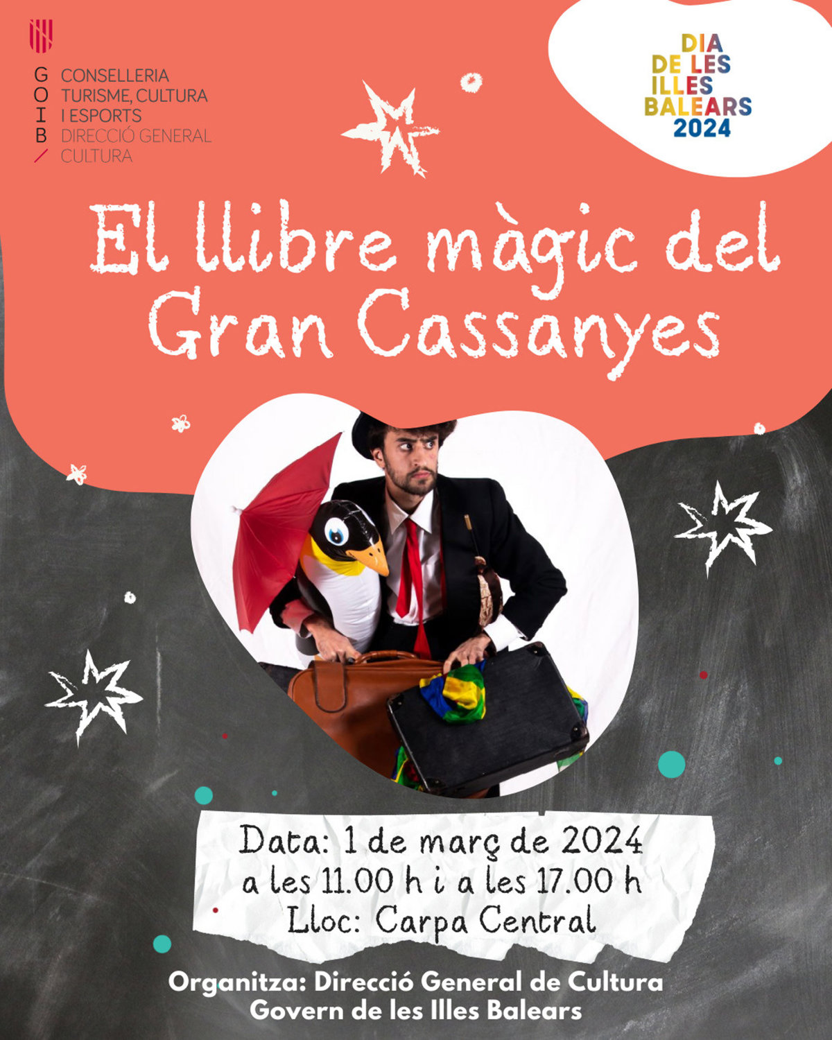 Por islas, en Mallorca, el Día 1 de marzo la cita estará en el escenario de la Carpa Gran instalada en el paseo Sagrera con el espectáculo infantil 'El llibre mgic del gran Cassanyes'. Dirigido a niños de tres a diez años, se trata de un espectáculo teatral y de magia que fomenta la importancia de los libros y la lectura. El Gran Cassanyes es un mago peculiar que después de viajar por todo el mundo ha olvidado cómo se hacían sus juegos de magia y con la ayuda de sus libros y de los niños intentará recuperarlos. Habrá dos funciones a las 11.00 y a las 17.00 horas.