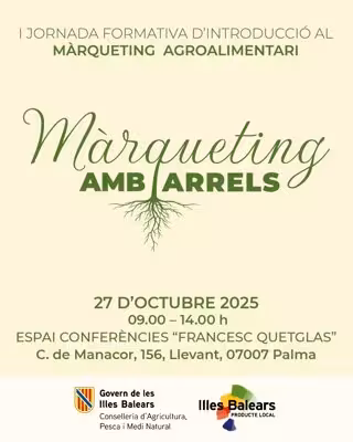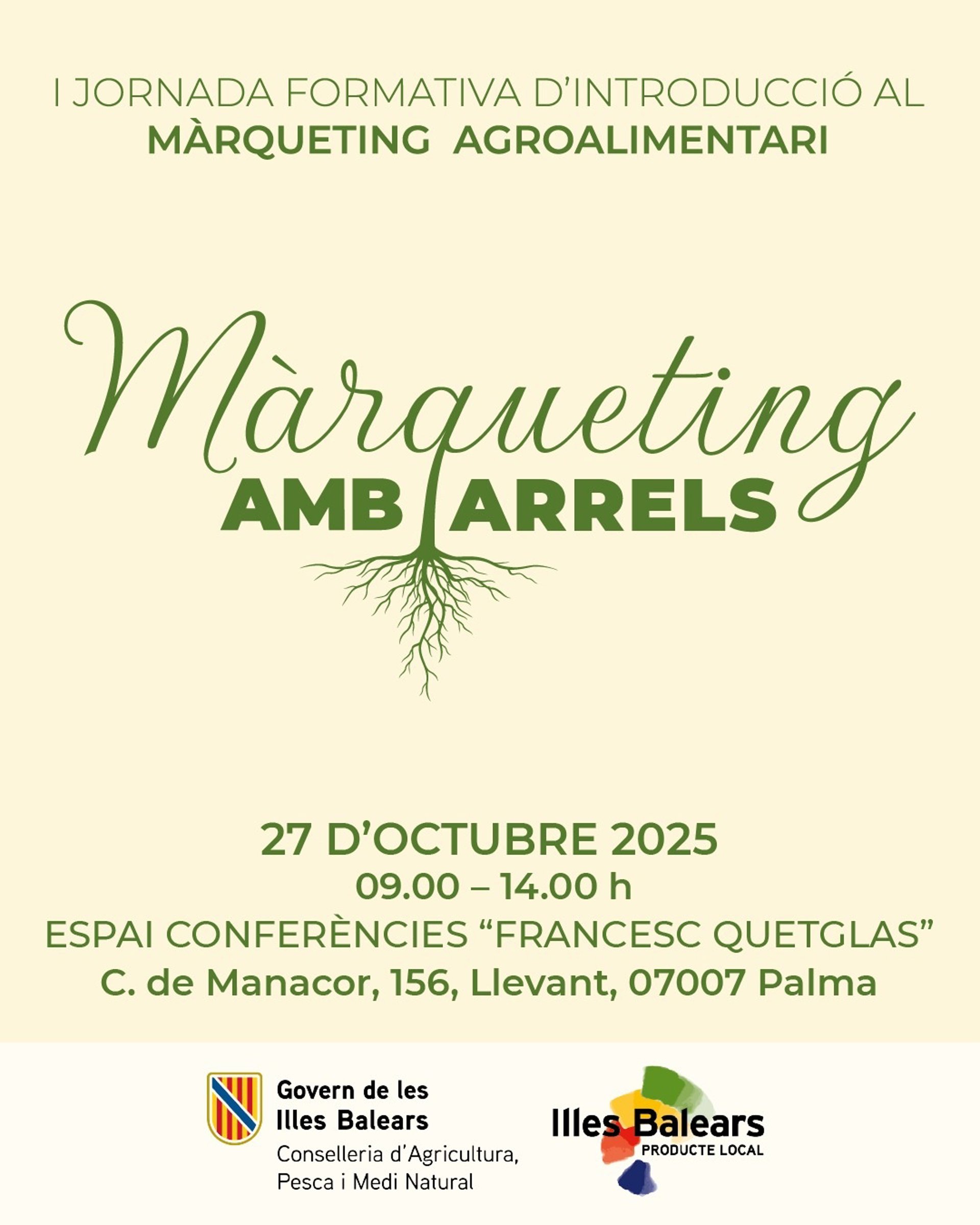 La Conselleria de Agricultura, Pesca y Medio Natural ha organizado una jornada formativa de introducción al marketing agroalimentario, bajo el título 'Marketing con raíces', que tendrá lugar el 27 de octubre, de 09.00 a 14.00 horas, en el espacio Francesc Quetglas.