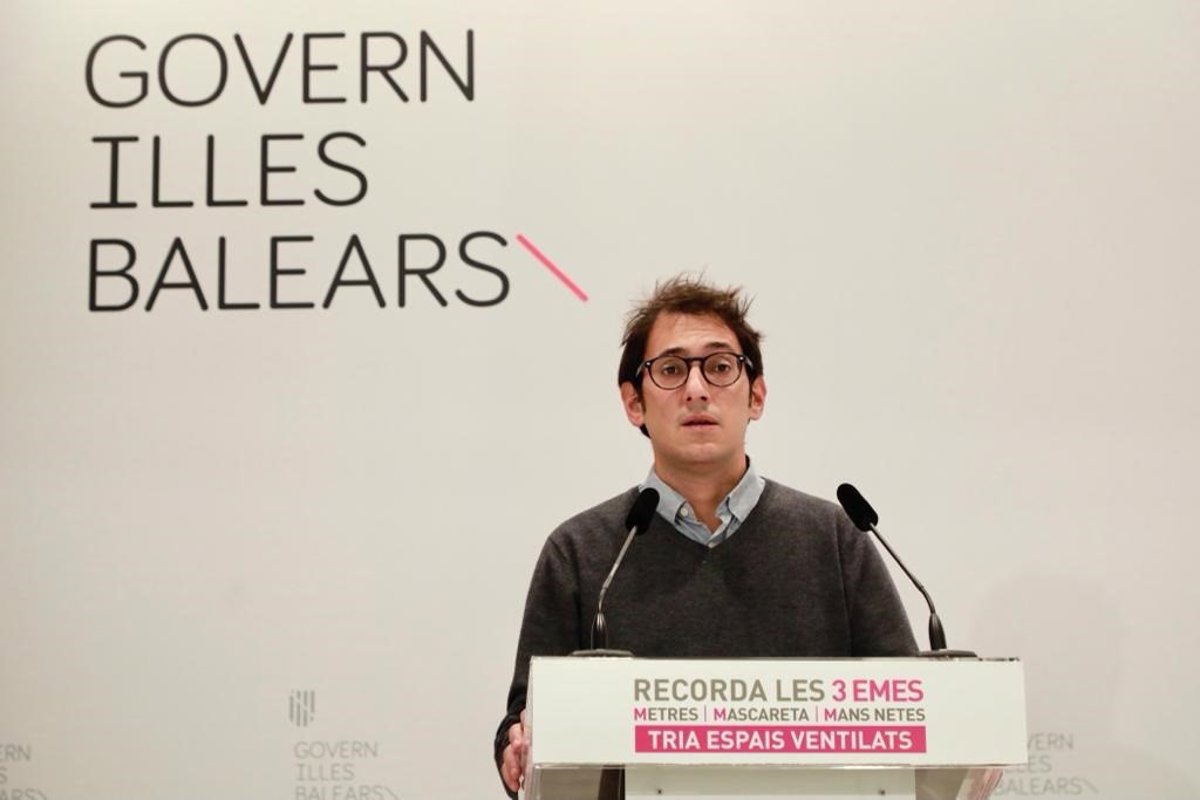 El portavoz del Govern y conseller de Modelo Económico, Turismo y Trabajo, Iago Negueruela, en una rueda prensa en el Consolat de Mar. - CAIB