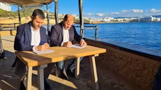 El conseller de Medio Ambiente y Territorio, Miquel Mir, y el alcalde de Sant Antoni de Portmany, Marcos Serra, han firmado el convenio de colaboración entre el Consorcio para la Recuperación de la Fauna de Baleares (Cofib) y el Ayuntamiento para la puesta en marcha de un centro de recuperación y conservación de fauna marina en las instalaciones de Es Cap Blanc.