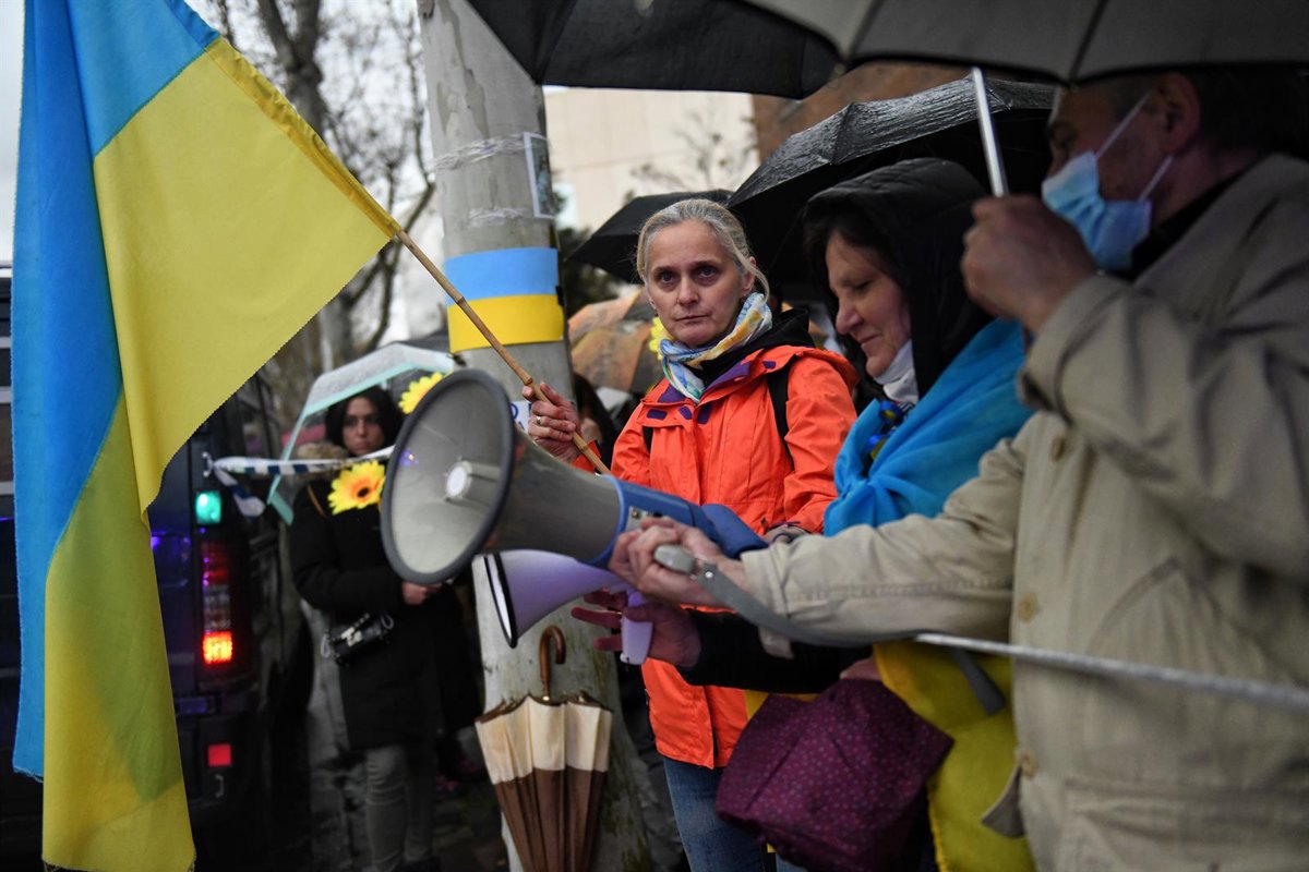 Archivo - Una mujer con un altavoz durante una manifestación en apoyo a Ucrania frente a la Embajada de Rusia. - Fernando Sánchez - Europa Press - Archivo
