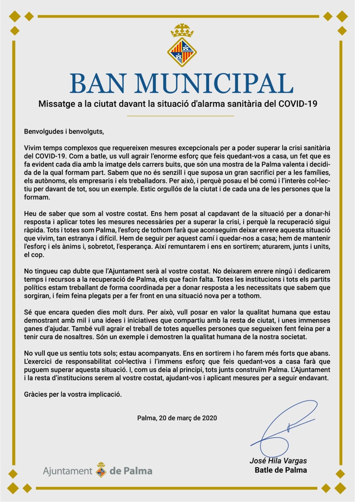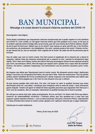 El alcalde de Palma, José Hila, ha dictado un bando con el fin de "agradecer el enorme esfuerzo" de la ciudadanía quedándose en sus casas para hacer frente a la crisis sanitaria del Covid-19.