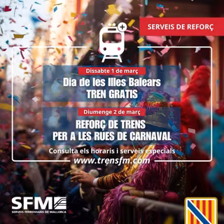 Serveis Ferroviaris de Mallorca (SFM) habilita trenes especiales este domingo con motivo de la Rua de Carnaval y, además, este sábado ofrecerá el servicio de tren gratuito con motivo de la celebración del Día de Baleares.