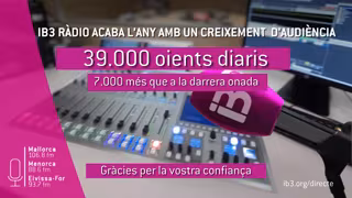 IB3 Rdio ha registrado una audiencia media de 39.000 oyentes diarios en el último Estudio General de Medios (EGM), 7.000 más que en el anterior, y es la tercera cadena de radio más escuchada en Baleares en el 'prime time' radiofónico, entre las 07.00 y las 10.00 horas.