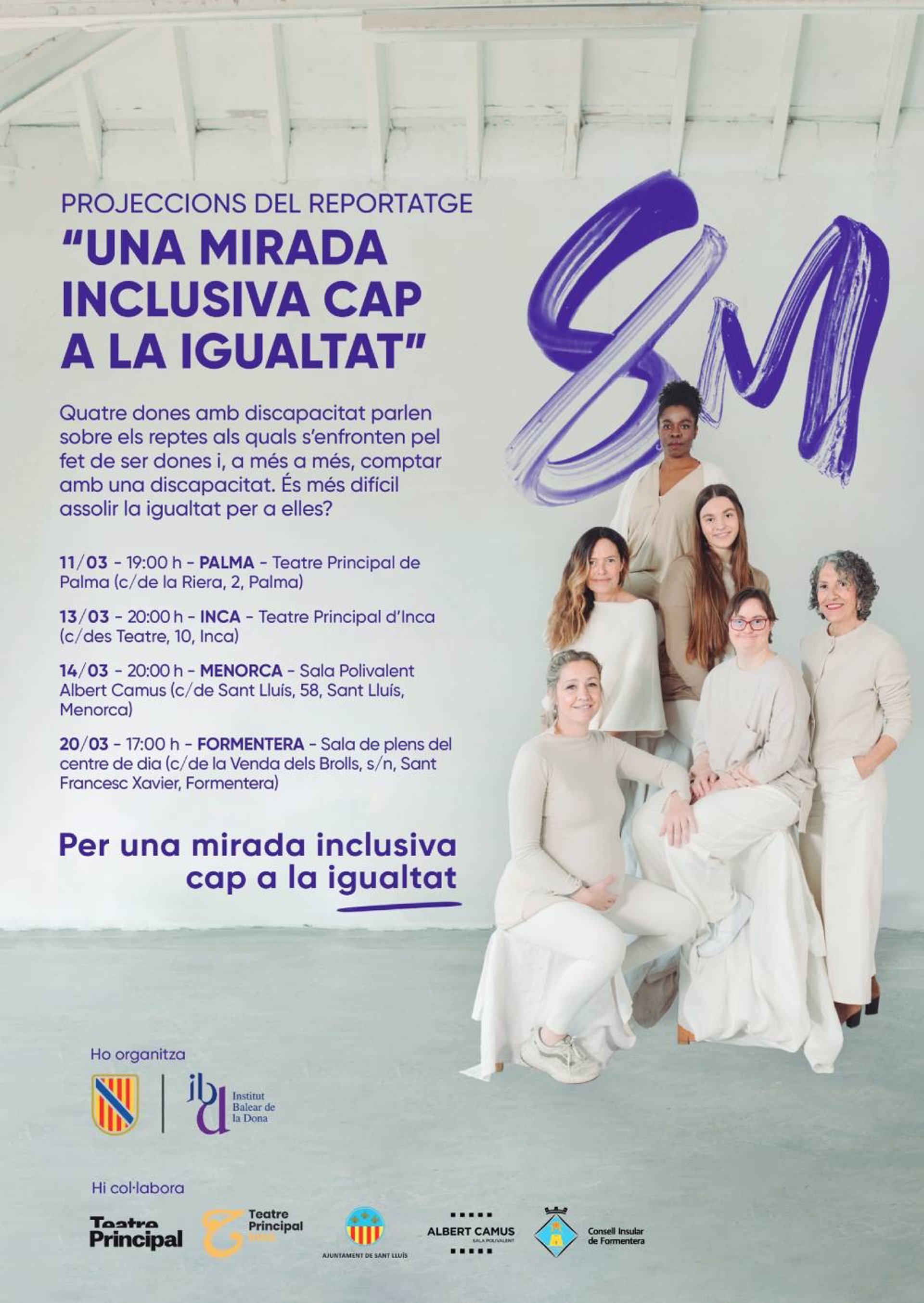 El Institut Balear de la Dona (IbDona) estrenará el próximo martes, día 11 de marzo, el reportaje 'Una mirada inclusiva cap a la igualtat' en el Teatre Principal de Palma, con motivo de la celebración del Día Internacional de la Mujer, que se conmemoró el 8 de marzo (8M).