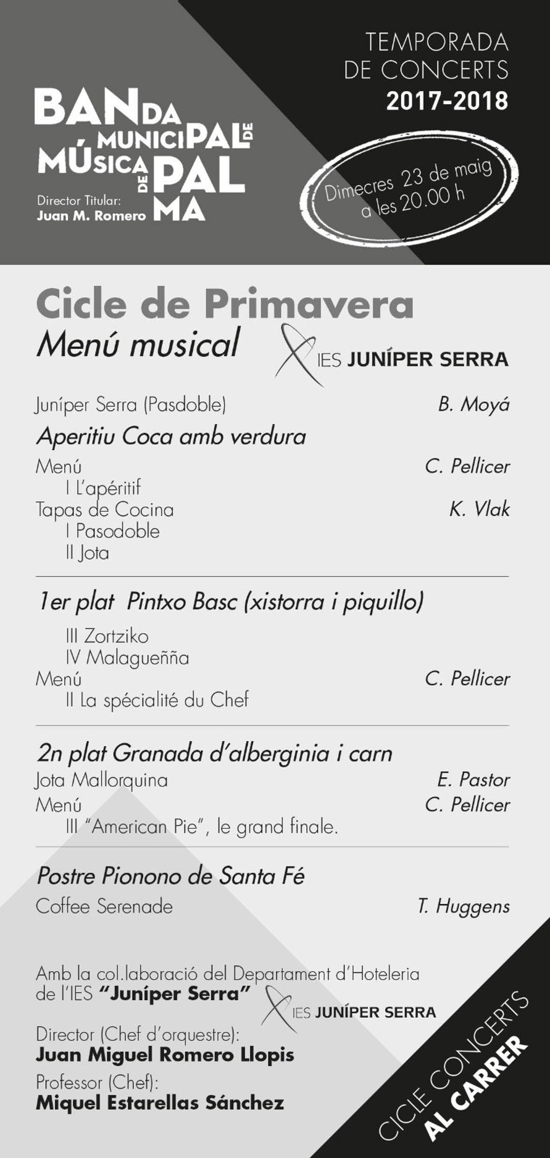 El IES Juníper Serra acogerá este miércoles un concierto gratuito y sin límite de aforo de la Banda Municipal de Música de Palma, que estará acompañado de una muestra gastronómica del Departamento de Hostelería del centro a cargo del chef Miquel Estarellas.
