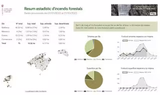 Por superficie arbolada, los datos de Ibanat apuntan a que se han quemado 6,71 hectáreas, de las cuales 5,49 corresponden a Mallorca, 0,07 en Menorca, 1,14 en Ibiza y 0,02 en Formentera.
