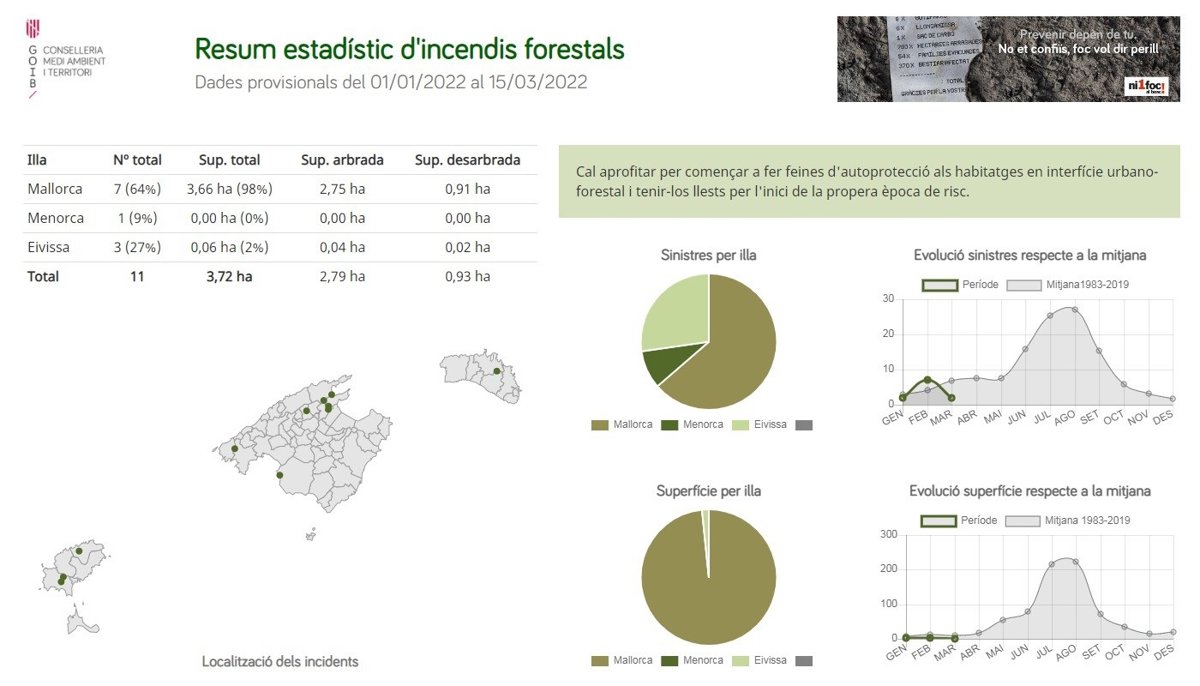 El Instituto Balear de la Naturaleza (Ibanat) del Govern ha destacado que, desde el 1 de enero y hasta el 15 de marzo, un total de 3,72 hectáreas se han quemado en las Islas por episodios de incendio o conatos de incendio forestal.