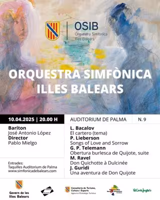 En nota de prensa, la Conselleria de Turismo, Cultura y Deportes ha informado que la Orquesta Sinfónica de Baleares ofrecerá el noveno concierto de temporada, el 10 de abril, a las 20.00 horas, en el Auditòrium de Palma. Se interpretarán obras de Bacalov, Lieberson, Telemann, Ravel y Guridi. Un concierto donde la literatura marca a los compositores y es un fiel reflejo del poder de la palabra en los sonidos. Las entradas ya están a la venta y se pueden comprar a través de la web de la Sinfónica o en las taquillas del Auditòrium.