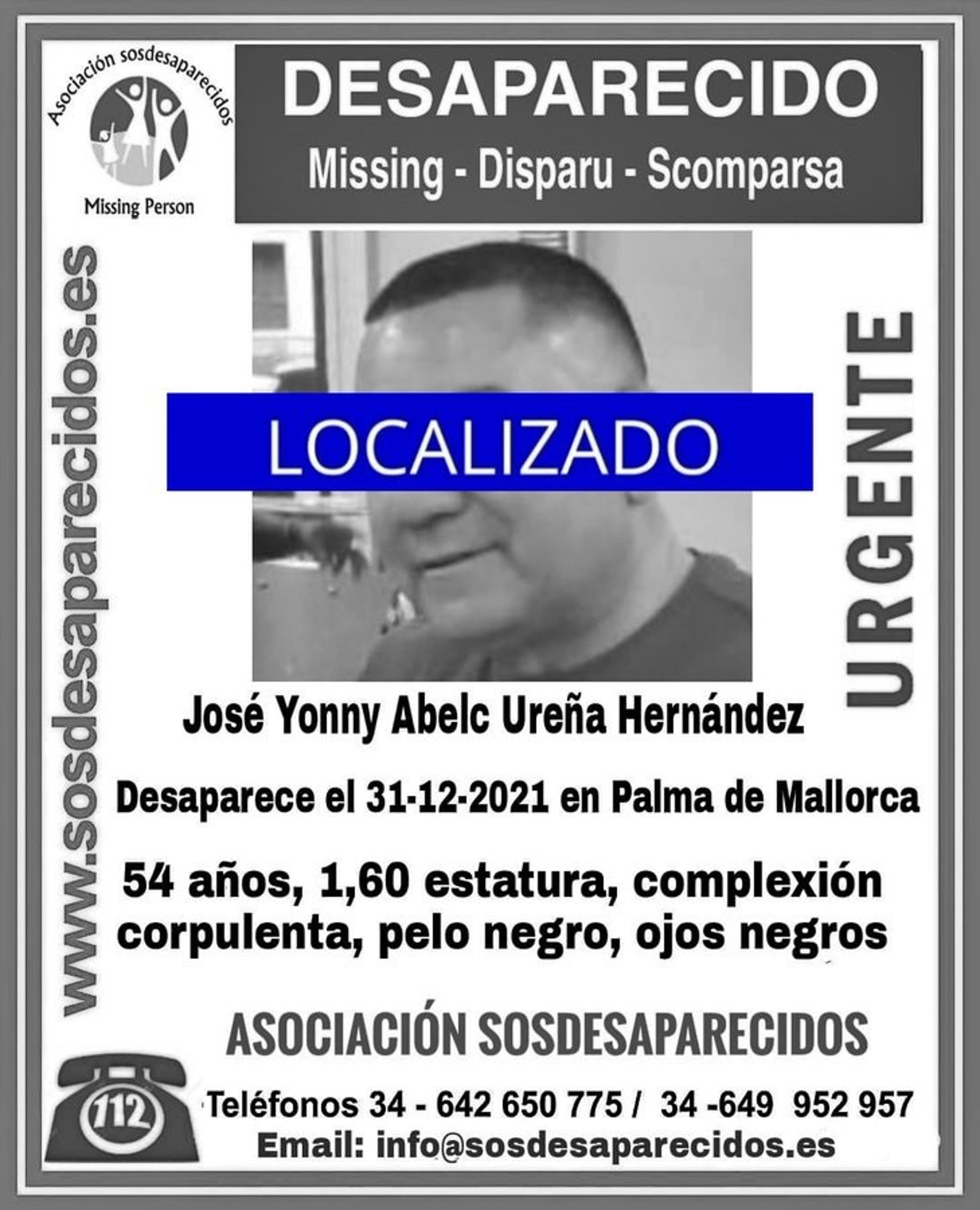 La asociación SOS Desaparecidos ha comunicado que ha sido localizado el hombre, de 54 años de edad, desaparecido el pasado 31 de diciembre en Palma.