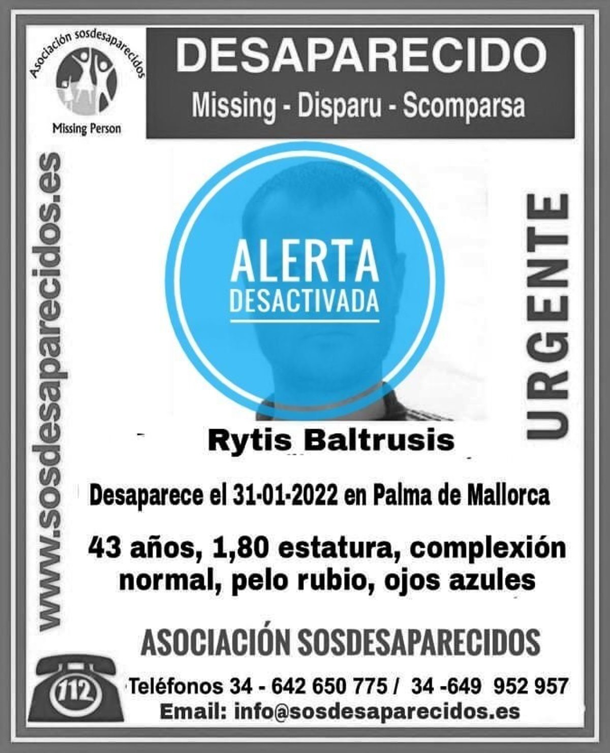 Según ha informado la Asociación a través de Twitter, se trata de Rytis Baltrusis, un varón que había sido visto por última vez el 31 de enero en la capital balear.