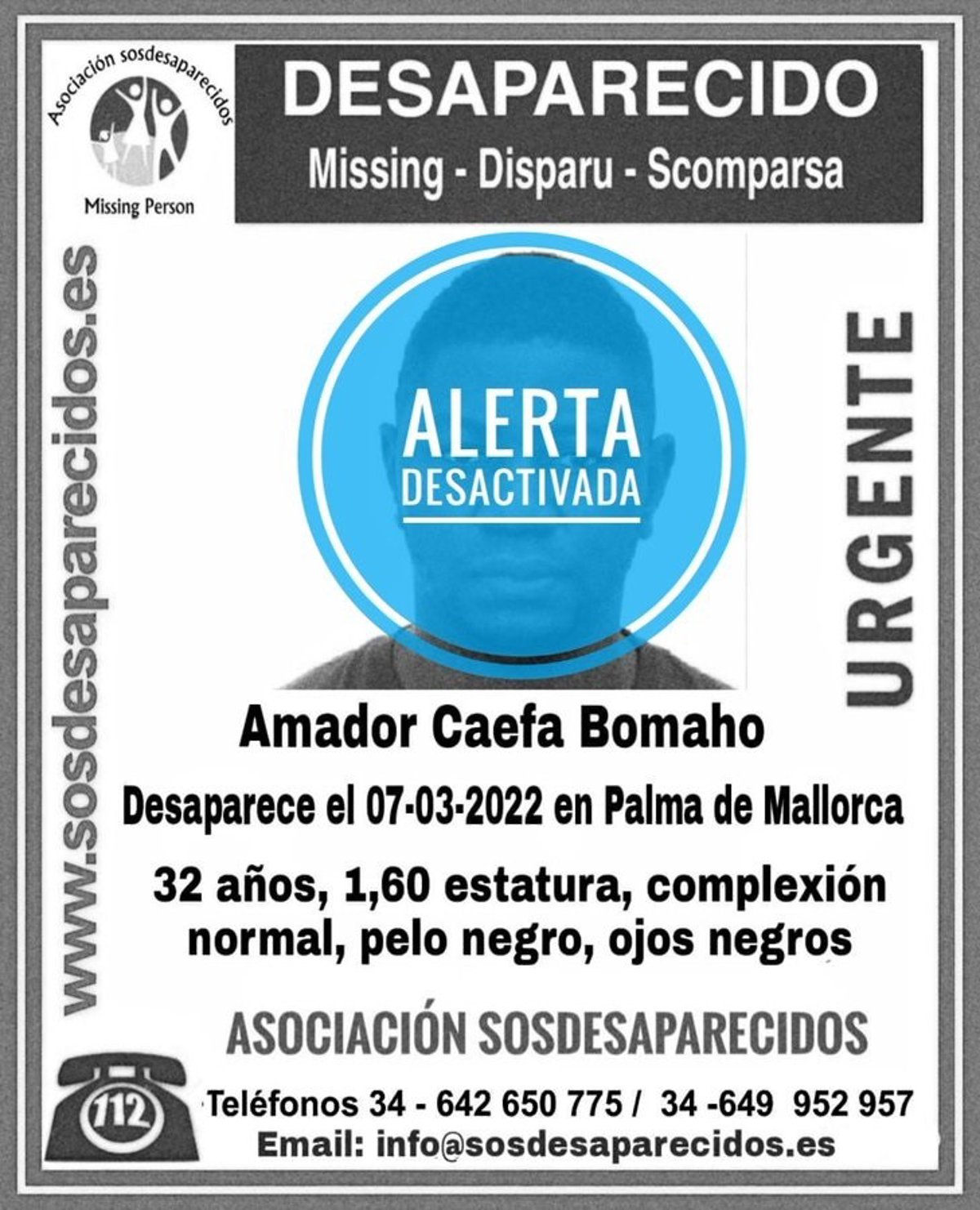 Localizado Amador Caefa Bomaho, desaparecido en Palma el 7 de marzo de 2022 - SOSDESAPARECIDOS