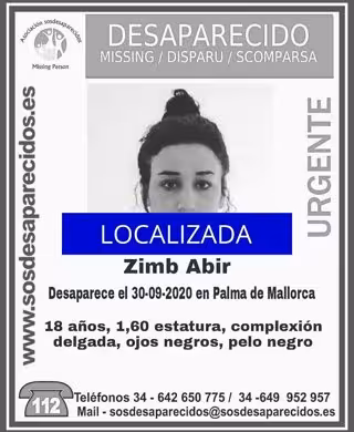 Según ha indicado la entidad a través de su cuenta de Twitter, se ha desactivado la alerta de búsqueda de Zimb Abir, una joven de 18 años desaparecida el pasado 30 de septiembre, y de Santiago Crespi, un joven de 24 años desaparecido el 28 de septiembre.