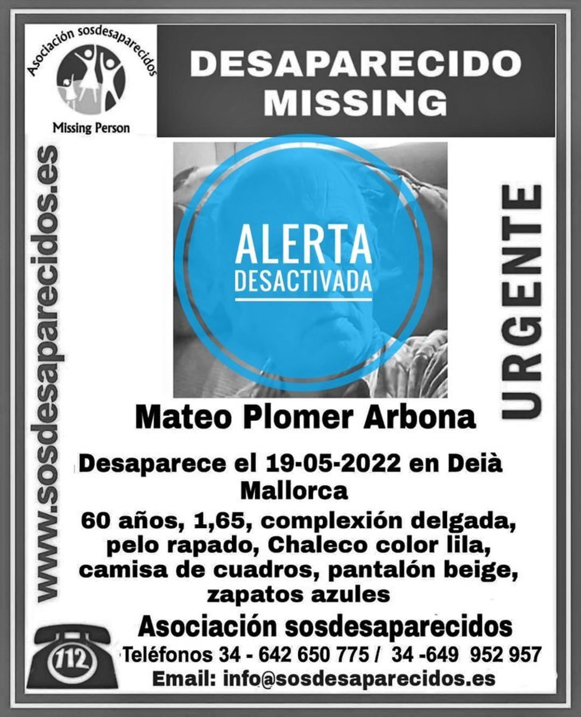 Según ha informado la asociación SOS Desaparecidos a través de un mensaje publicado en Twitter, se trata de Mateo Plomer Arbona, un varón, de 60 años de edad, que había sido visto por última vez el pasado 19 de mayo, en el municipio mallorquín de Dei.