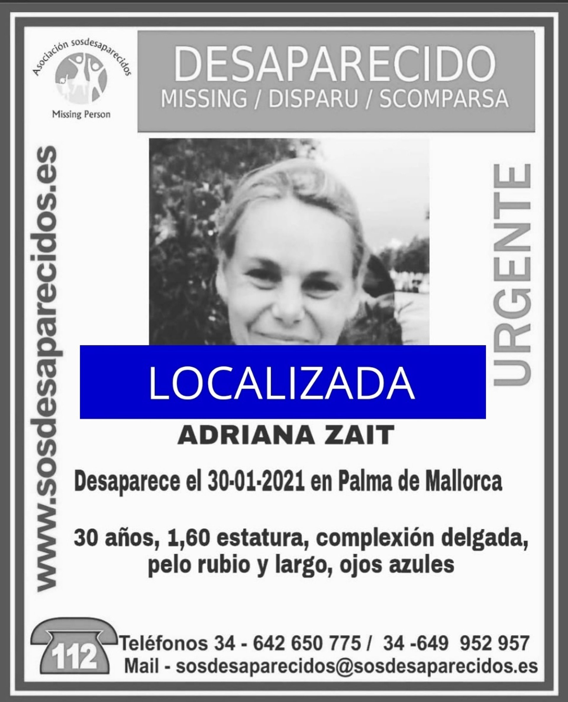 Adriana Zait, la mujer de 30 años que se encontraba en paradero desconocido desde el último fin de semana de enero ha sido localizada, según ha informado en Twitter la Asociación Sosdesaparecidos.