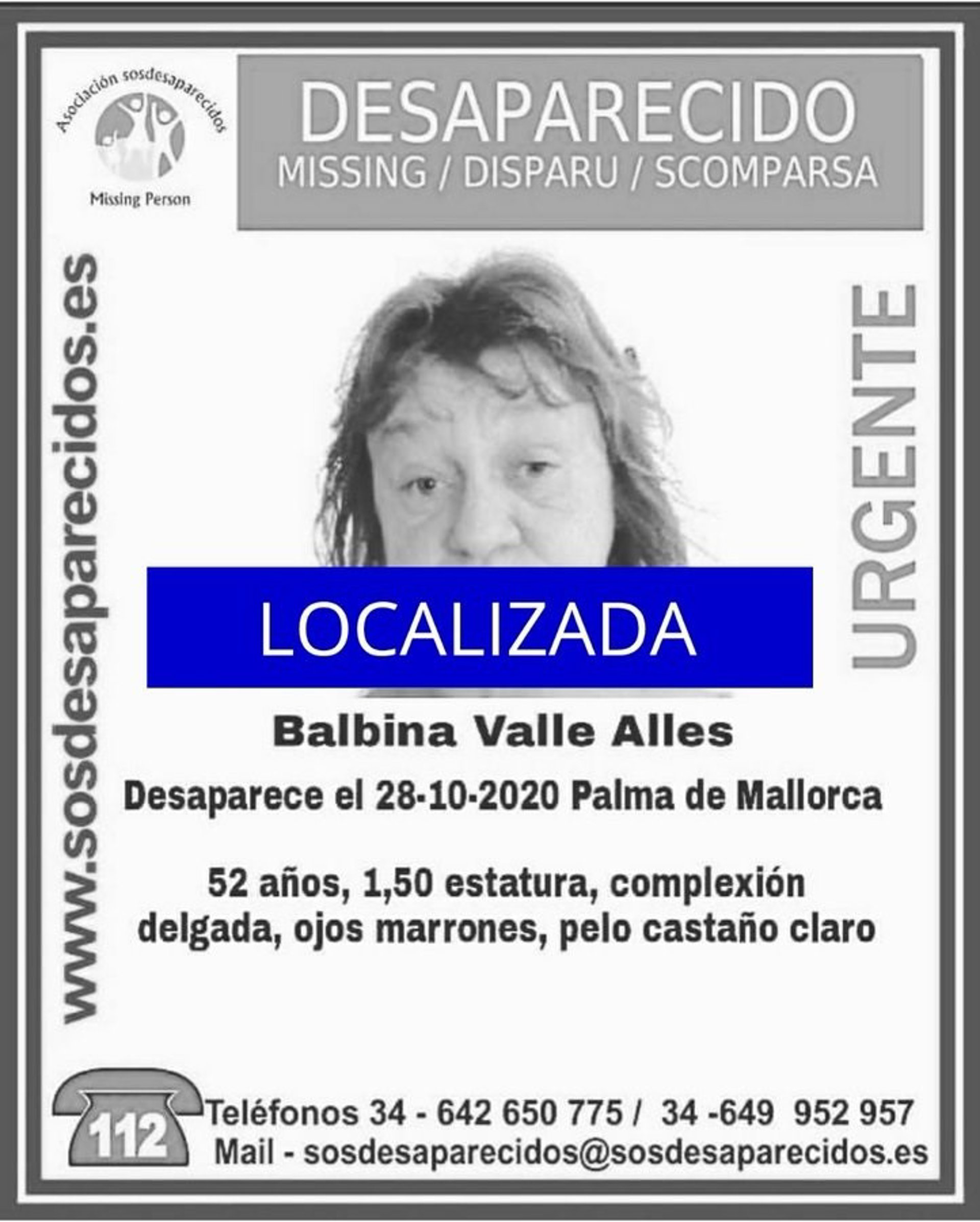 La Asociación SOS Desaparecidos ha informado este sábado de la localización de Balbina Valle Allés, quien se encontraba en paradero desconocido desde el pasado 28 de octubre.