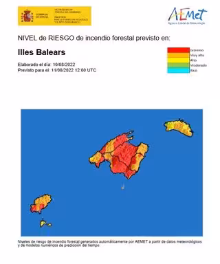 Además, la Aemet ha indicado que el índice de riesgo de incendio para este jueves es extremno en Ibiza y Mallorca, y muy alto en zonas de Menorca.